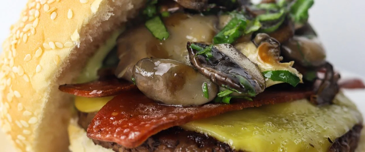 impossible patty, 'cheddar,' sauteed mushrooms, 'bacon', cilantro aioli, parsley